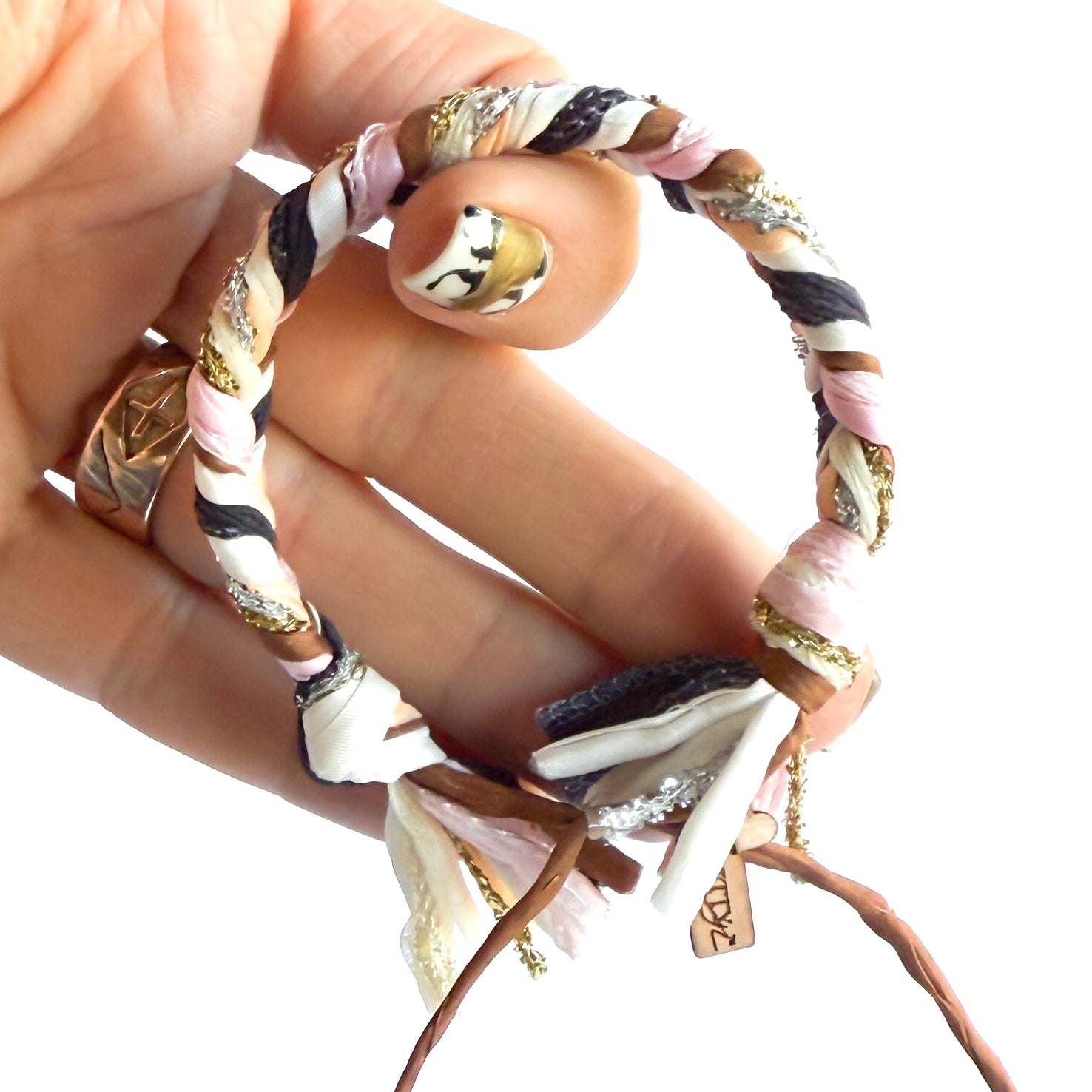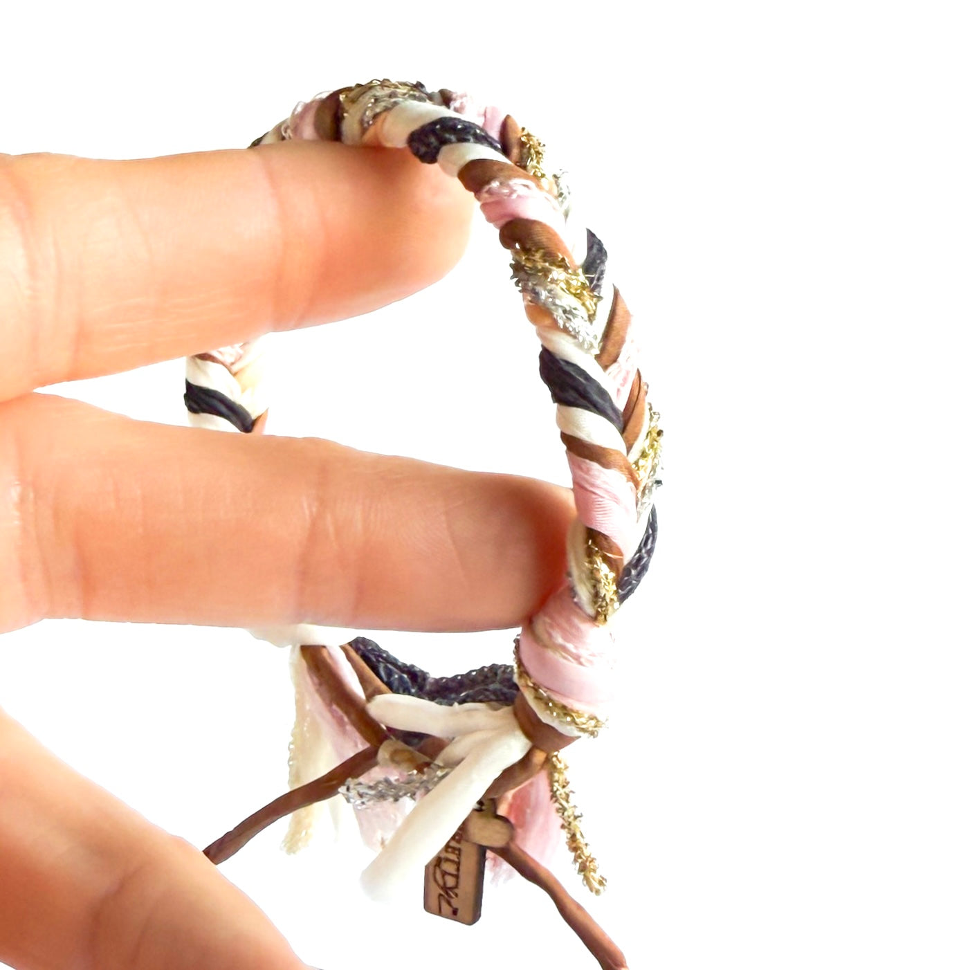 Our adjustable bracelets are so easy to wear & style! Simply pull open by holding each side of the braid, slide it over your hand, and then cinch it down to desired fit by pulling on the ends of the silk cord! Let the ends dangle or tie them in a bow for a second and super cute look...But NEVER cut the ends of your bracelet! Watch this video to see how they're put on! Each piece comes with a hand cut and stamped leather logo tag attached. If your piece has a leather heart charm attached it means JL made it - not all Pretty by JL Silk Bracelets come with a heart charm attached.