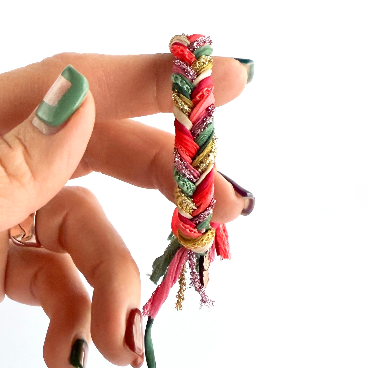 Our adjustable bracelets are so easy to wear & style! Simply pull open by holding each side of the braid, slide it over your hand, and then cinch it down to desired fit by pulling on the ends of the silk cord! Let the ends dangle or tie them in a bow for a second and super cute look...But NEVER cut the ends of your bracelet! Watch this video to see how they're put on! Each piece comes with a hand cut and stamped leather logo tag attached. If your piece has a leather heart charm attached it means JL made it - not all Pretty by JL Silk Bracelets come with a heart charm attached.