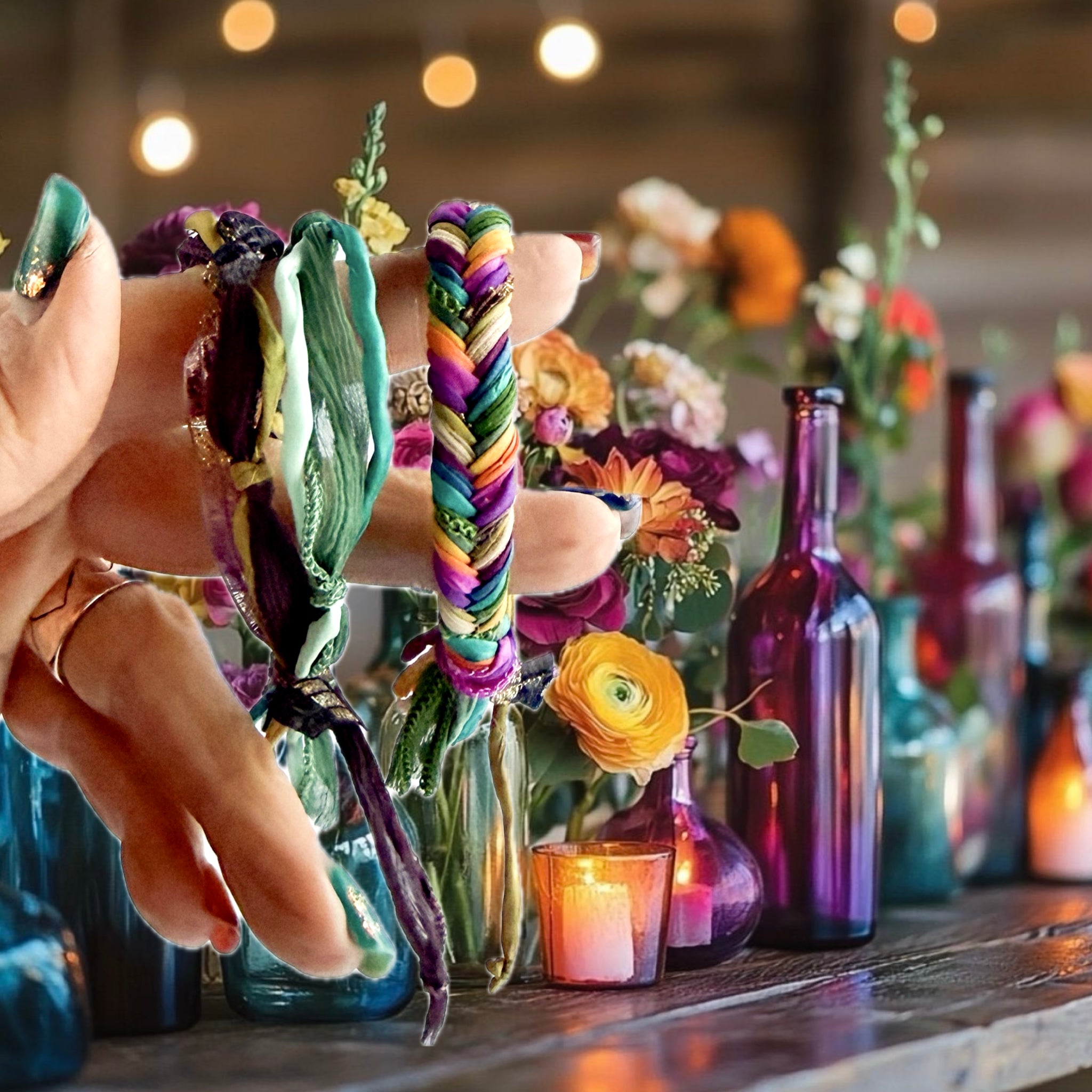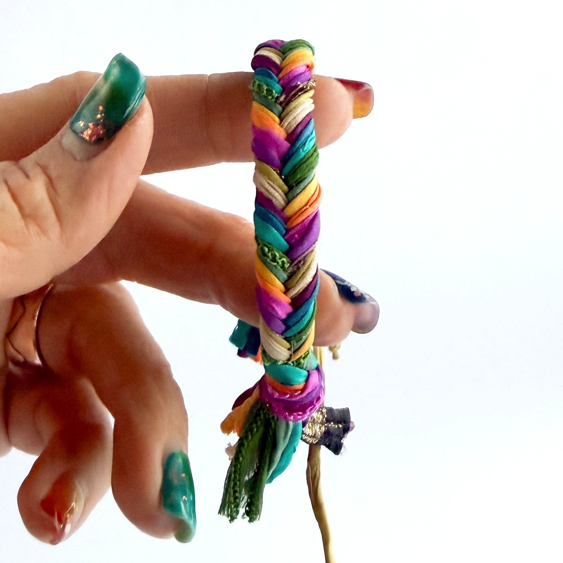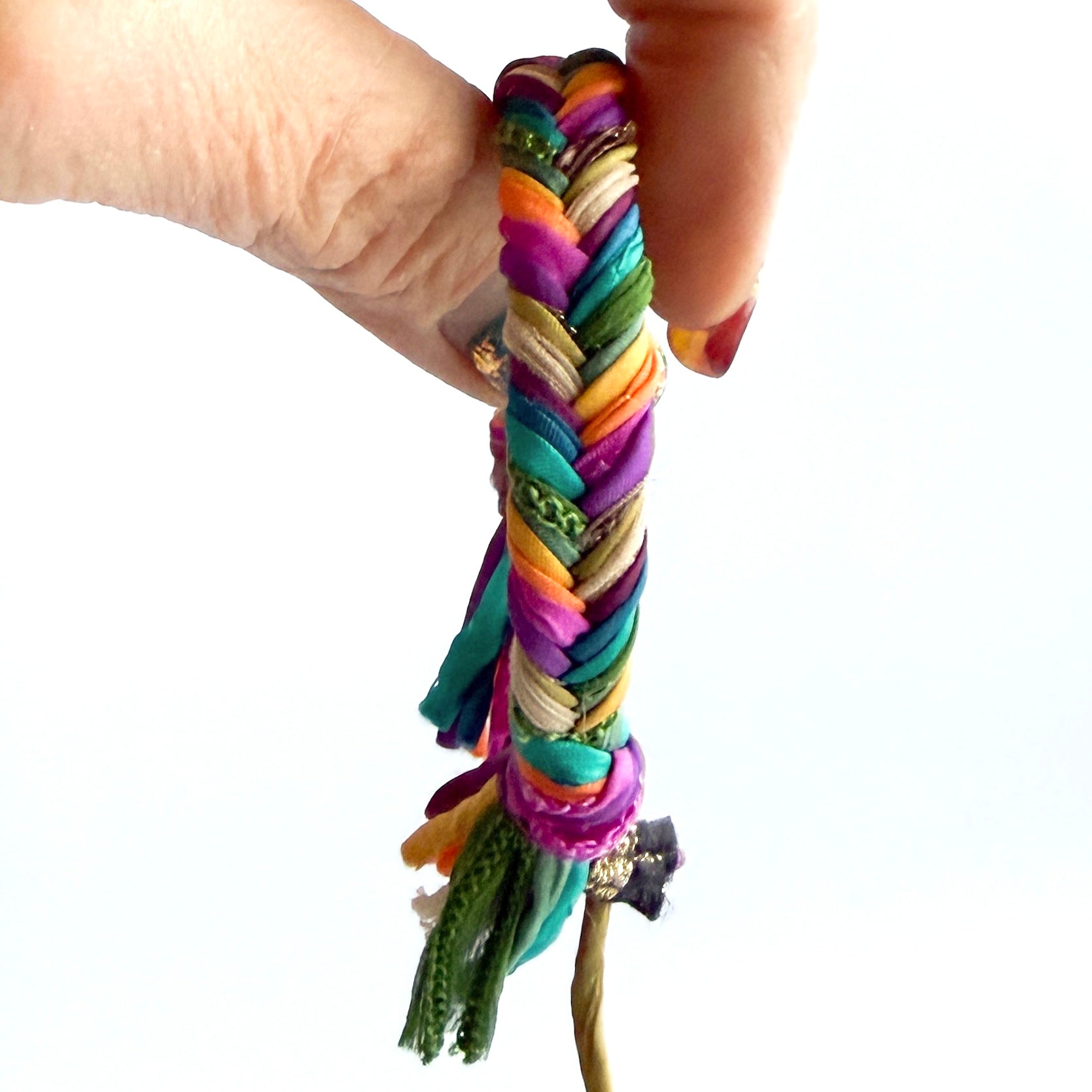 🏺 Mixed Media 6 Strand Double Forget Me Knot Boho/Woven- *Aubergine F.R., Mauve Dreamcatcher, Deer + Eucalyptus F.R., Aqua, Teal Silk w/sage wax