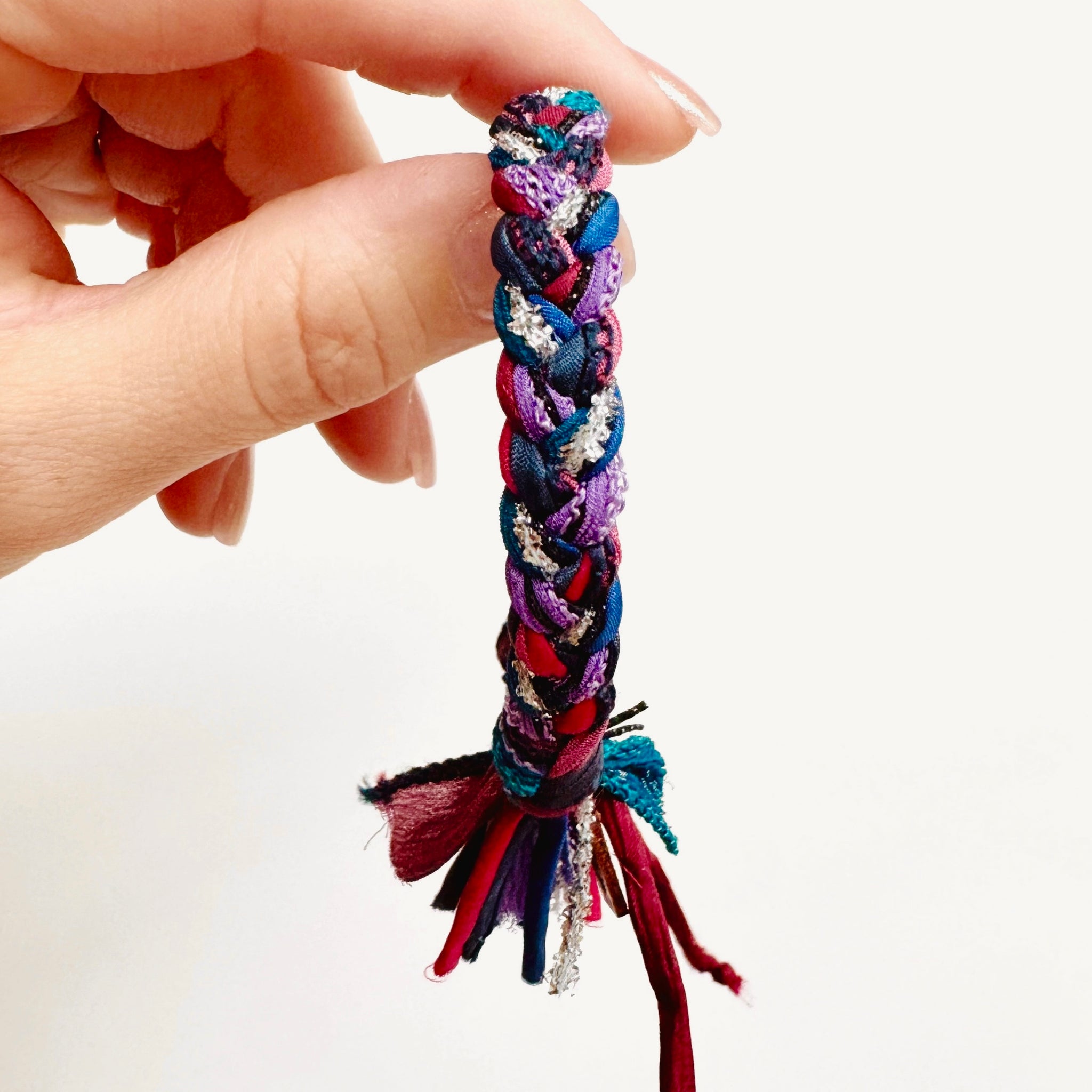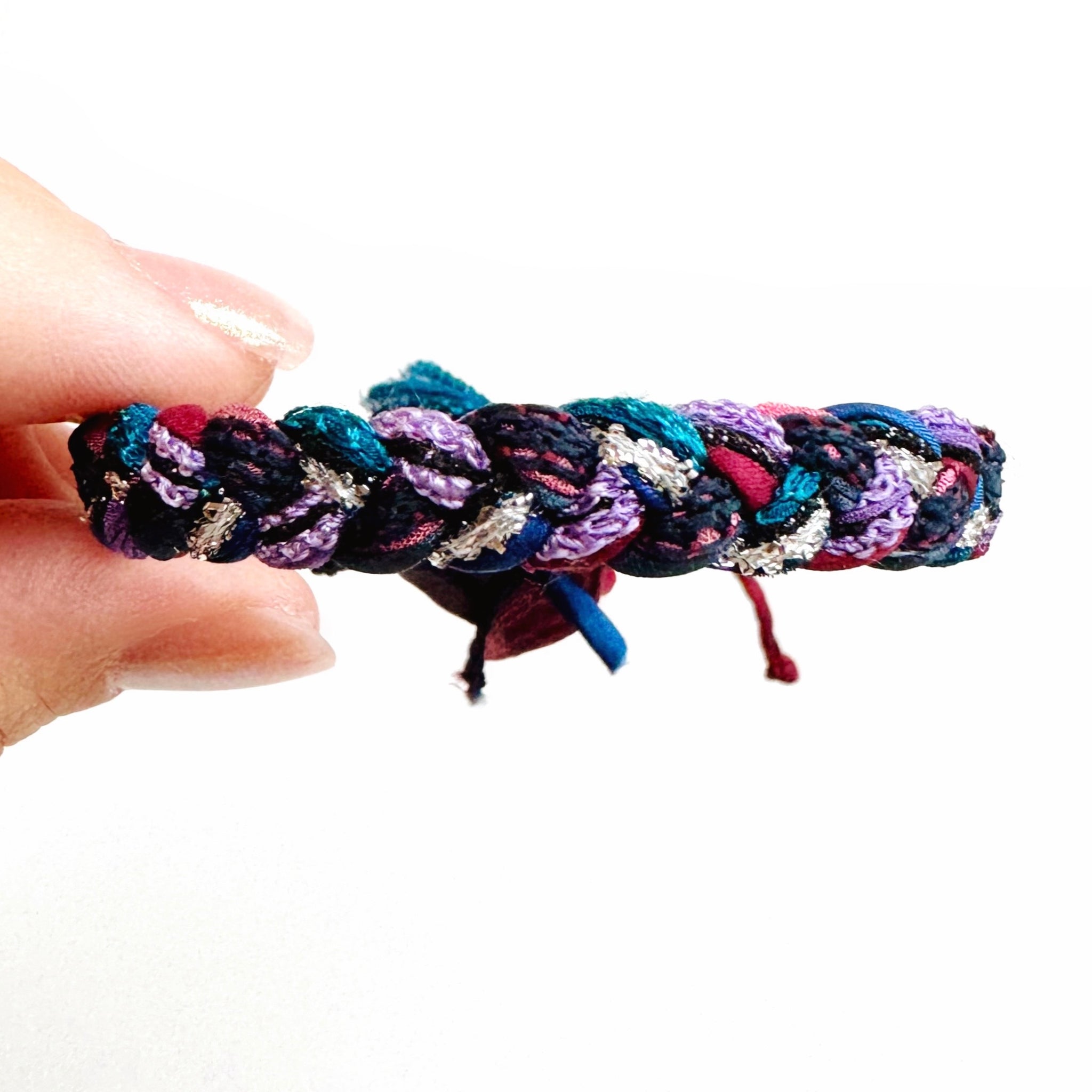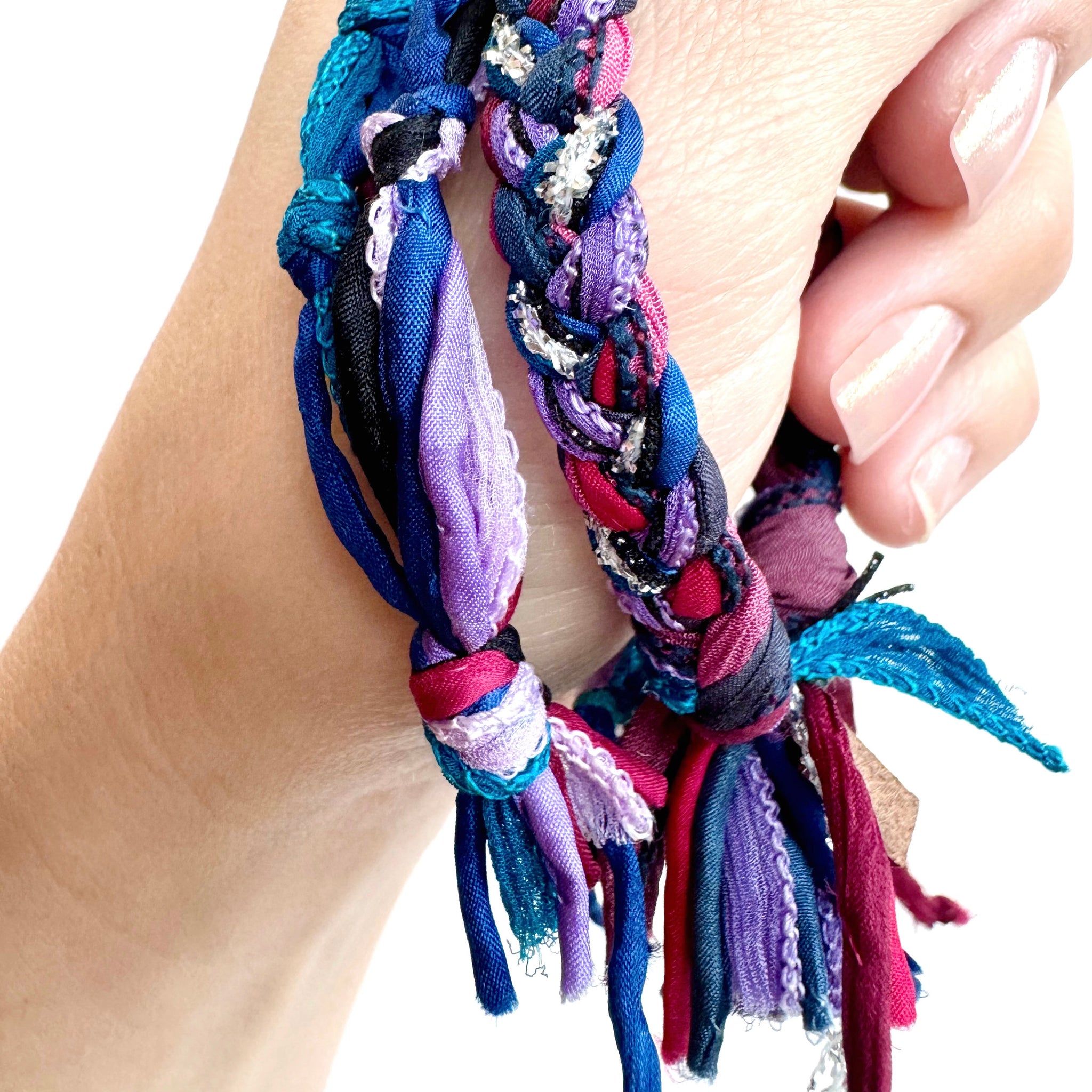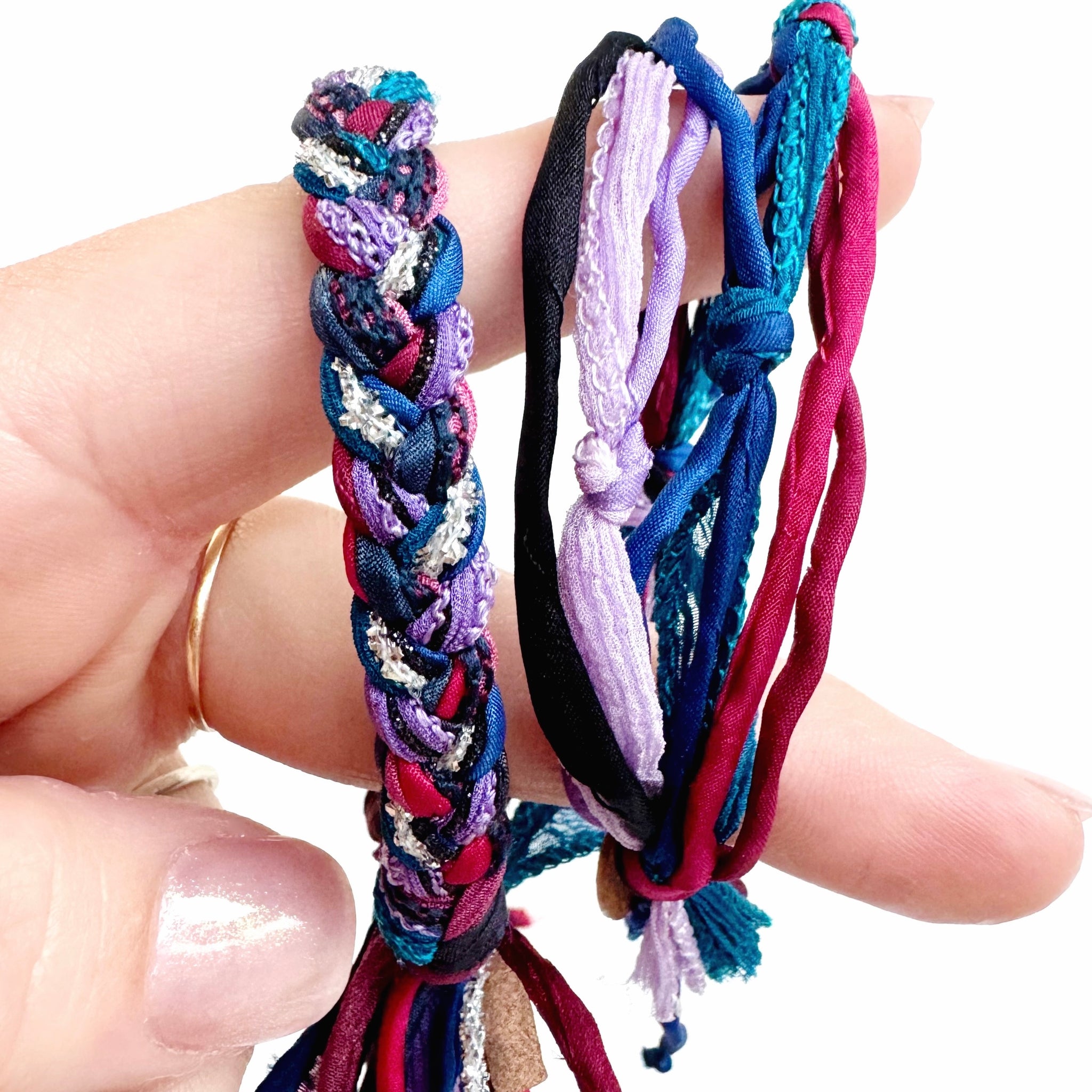 12 O’Clock Musings: A Fairy Rag Braid and 7 Strand Forget Me Knot in jewel-toned midnight blues, moody burgundies, night sky indigos shot through with a wistful lavender glow make up the 12 O’Clock Musings suite. Starry-eyed chaos, wrapped neatly around your wrist.