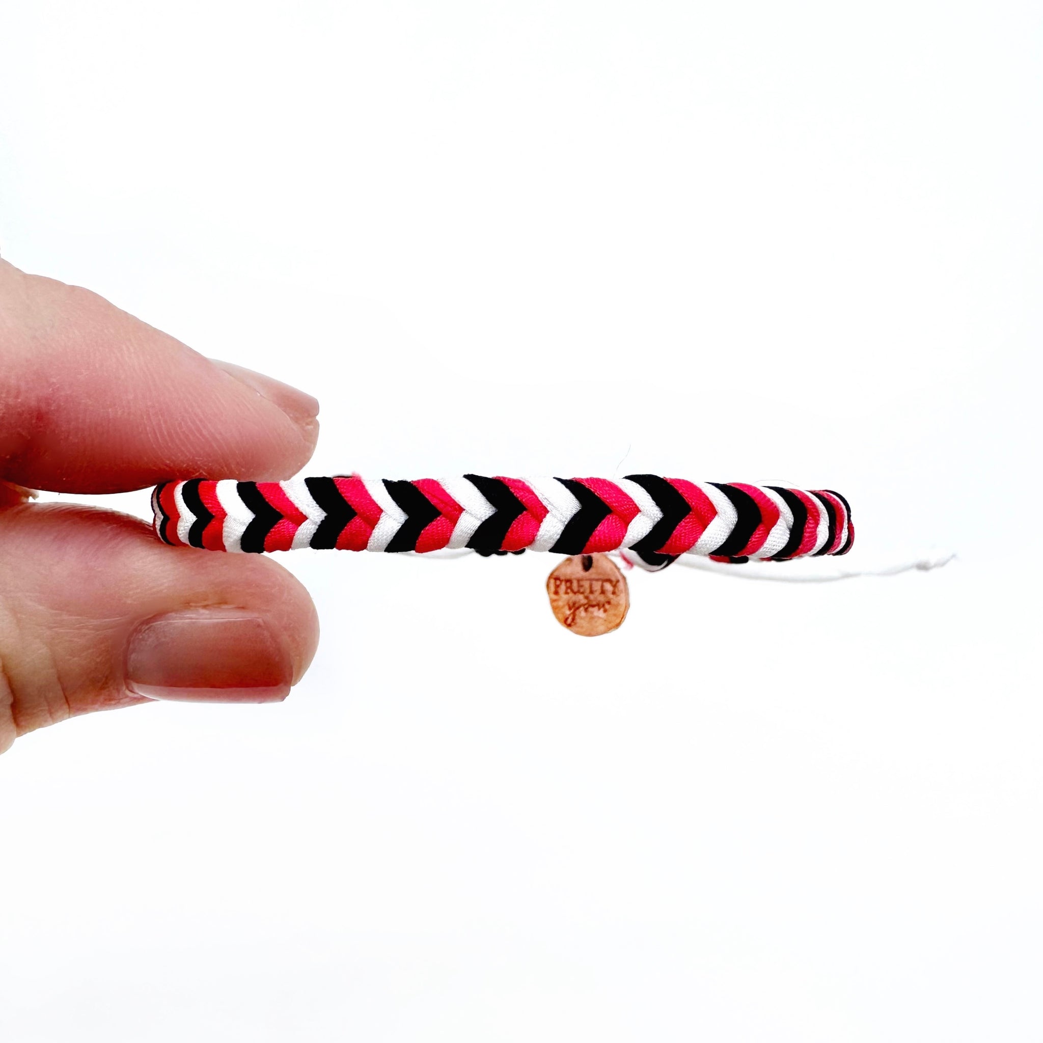 Our adjustable bracelets are so easy to wear & style! Simply pull open by holding each side of the braid, slide it over your hand, and then cinch it down to desired fit by pulling on the ends of the silk cord! Let the ends dangle or tie them in a bow for a second and super cute look...But NEVER cut the ends of your bracelet! Watch this video to see how they're put on! Each piece comes with a hand cut and stamped leather logo tag attached. If your piece has a leather heart charm attached it means JL made it - not all Pretty by JL Silk Bracelets come with a heart charm attached.