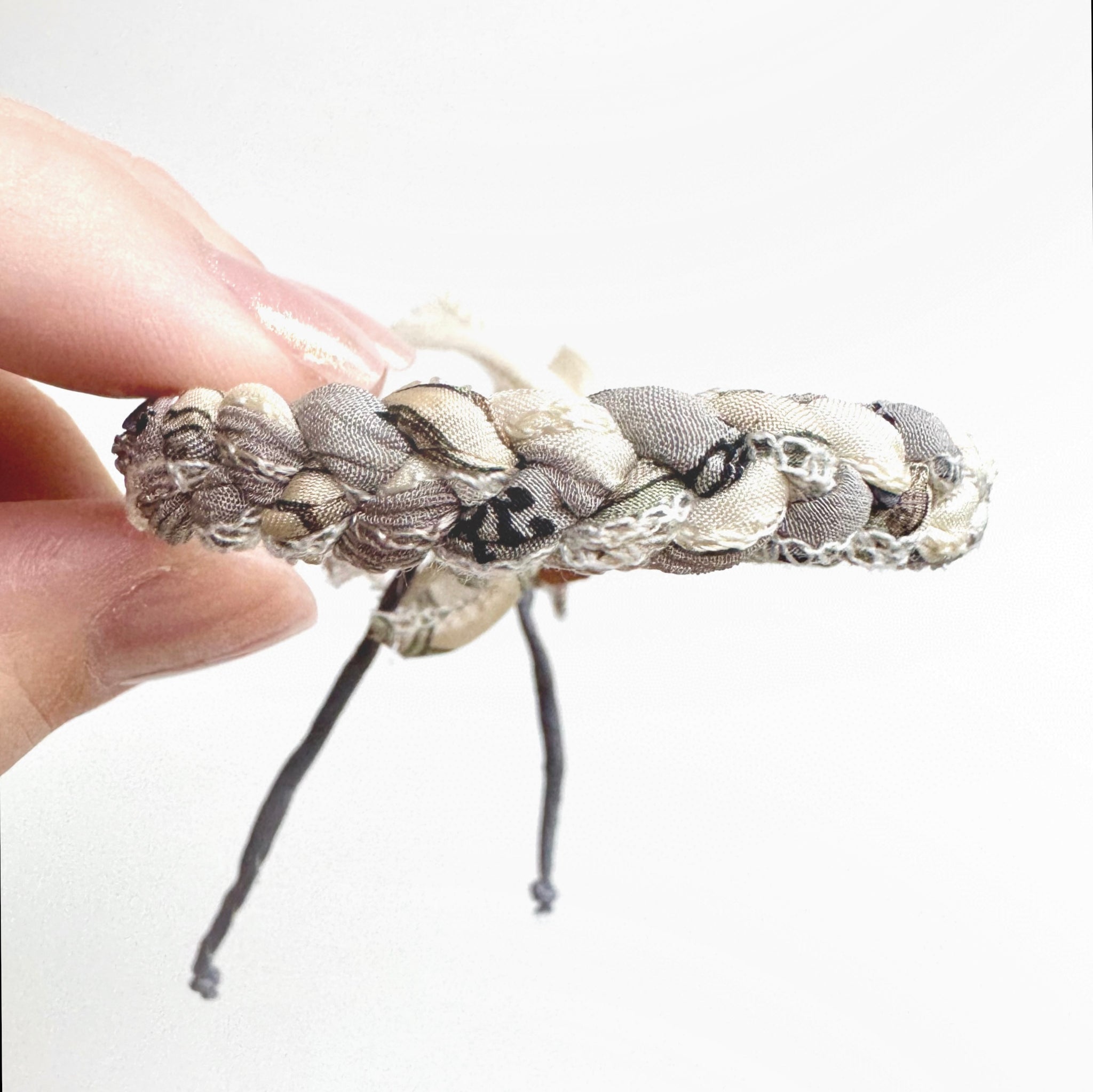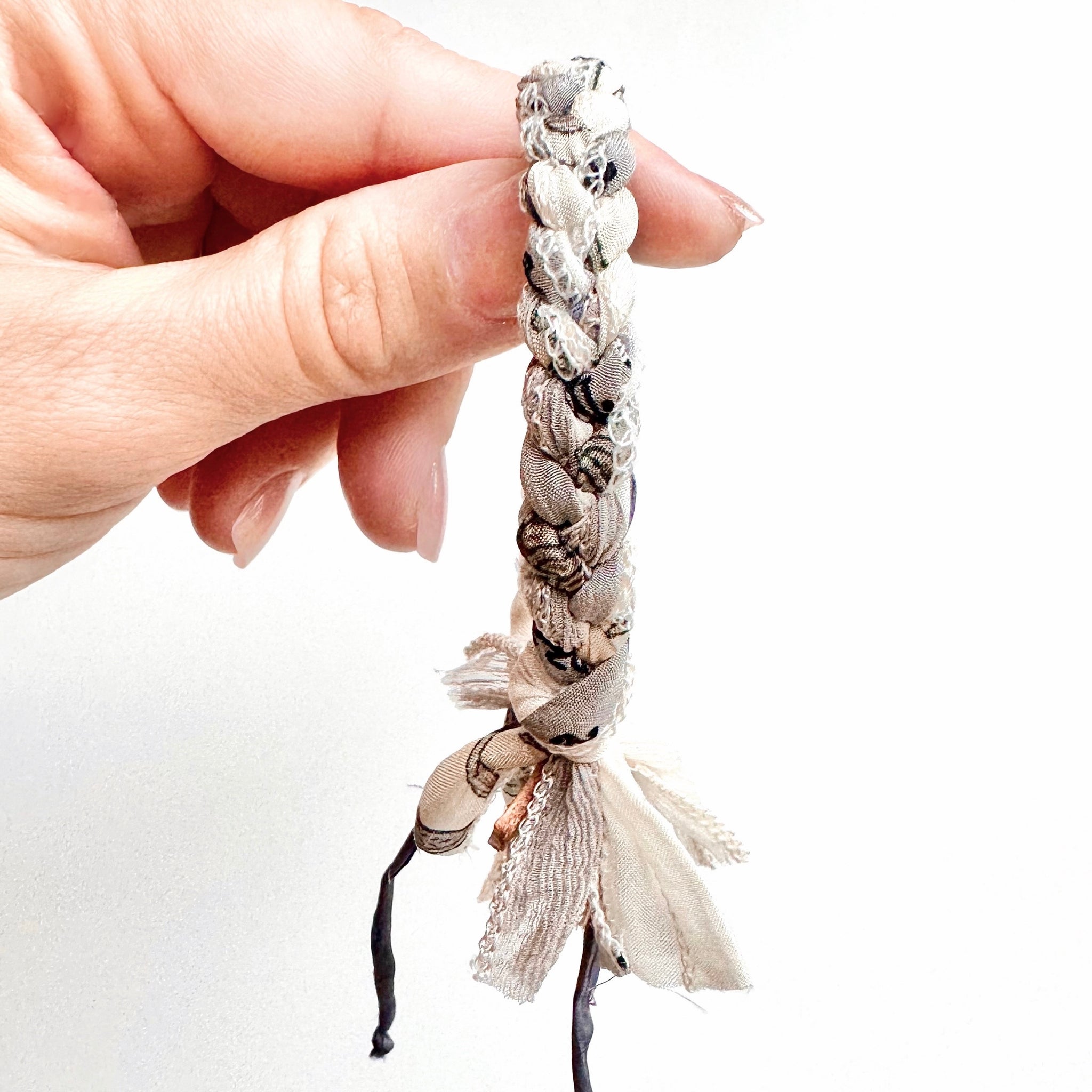 🩶🪩🌾 Tapestry Rag Braid: **Dark Grey, Cream Silk Ribbon^, Light Taupe FR + Shell, grey floral Tapestry Ribbon^, Cream FR + Cafe, cream floral Tapestry Ribbon^, Shell FR w/ cream wax