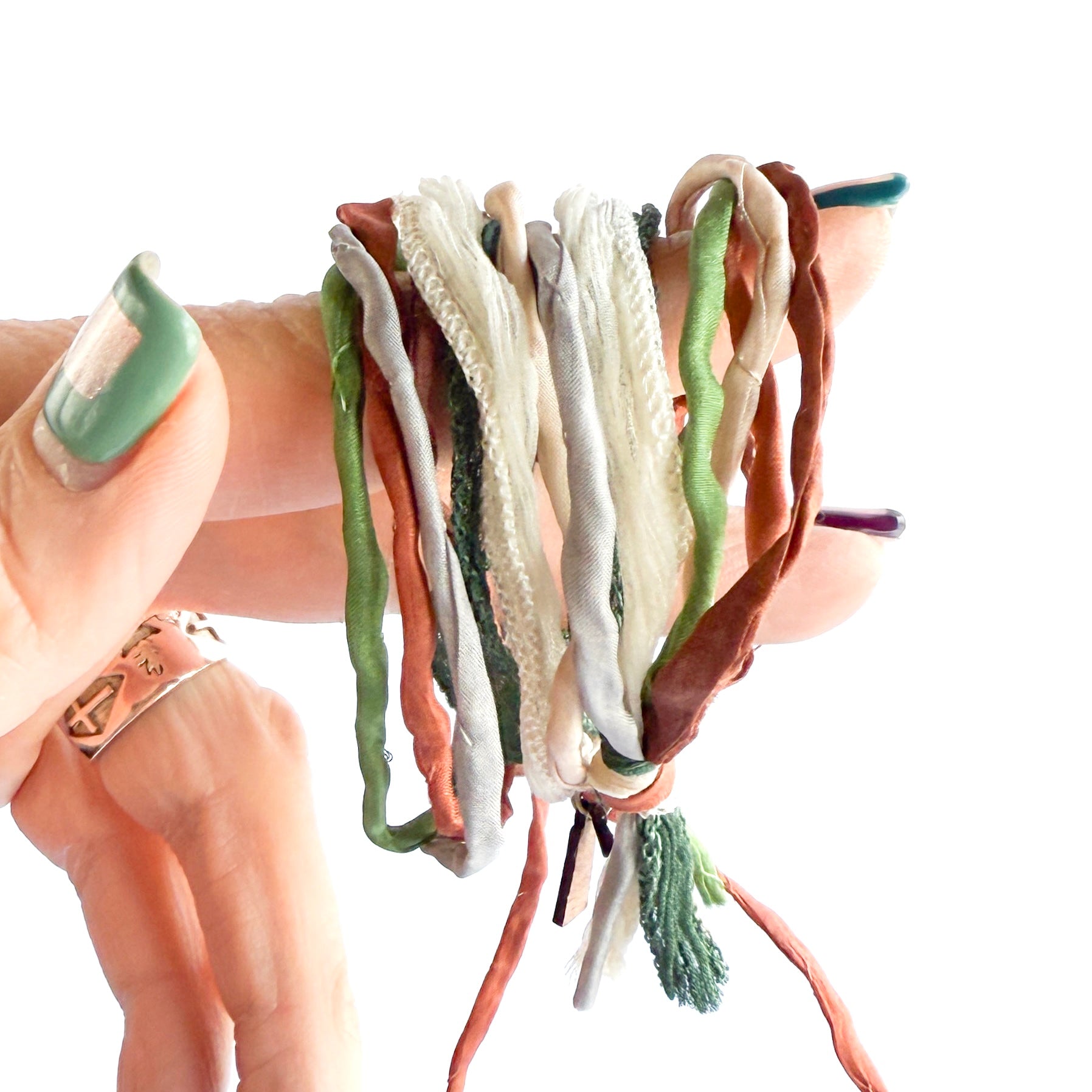 🥃 6 Strand Boho Forget Me Knot- Cream, Café + Copper, Black + Pine, Dark Green Silk